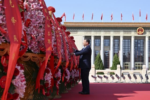 9月30日上午,党和国家领导人习近平、李强、赵乐际、王沪宁、蔡奇、丁薛祥、李希、韩正等来到北京天安门广场,出席烈士纪念日向人民英雄敬献花篮仪式。这是习近平整理花篮上的缎带。新华社记者 李响 摄