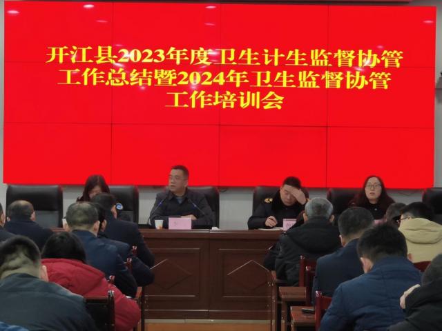 2024年1月31日上午,开江县卫生健康局委托县卫生和计划生育监督执法大队召开2023年卫生监督协管工作总结暨2024年卫生监督协管工作培训会。县卫健局党委副书记、副局长李乂出席会议,县卫计执法大队全体人员和各乡镇卫生院(社区卫生服务中心)主要负责人、分管领导及卫生监督协管人员共80余人参加会议。