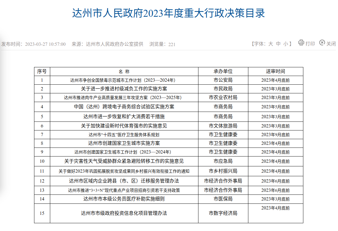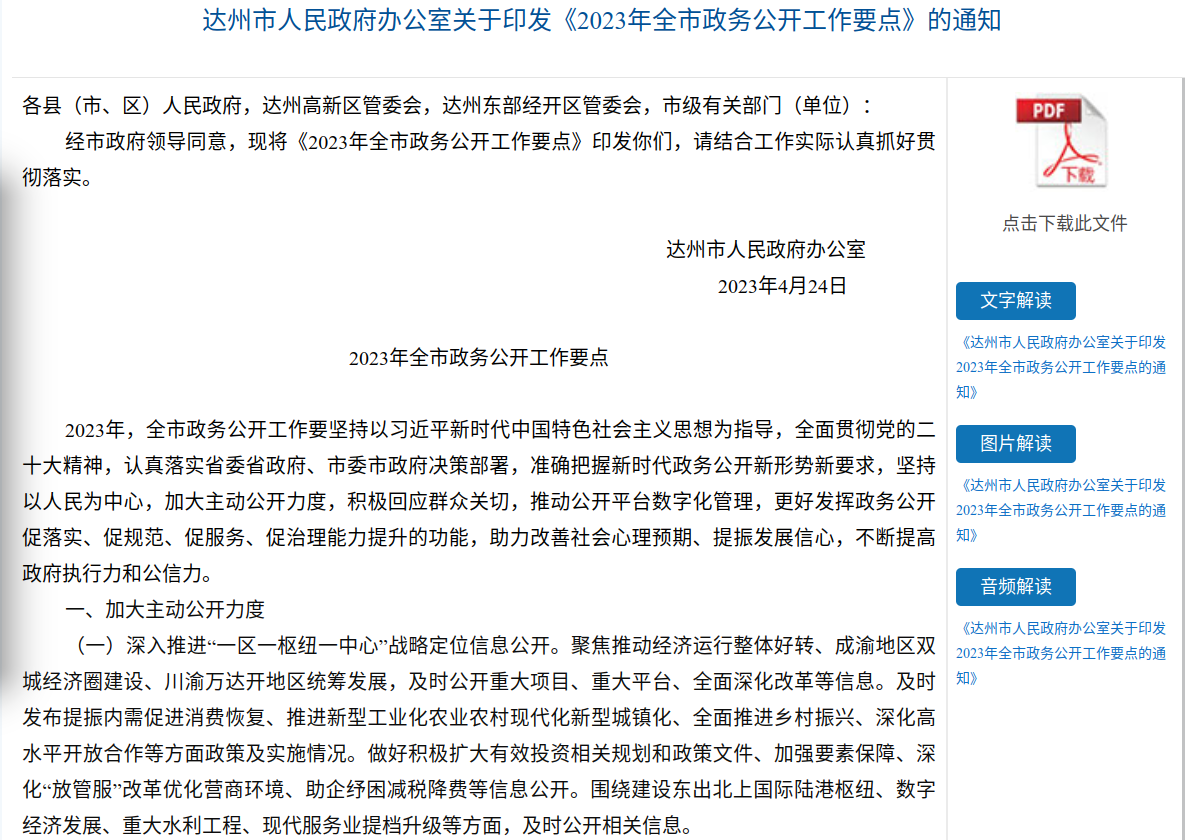 结合《四川省2023年政务公开工作要点》,制发《达州市2023年政务公开工作要点》,细化责任分工。开展工作调度1次,工作调研1次,督促各项工作任务落地落实。