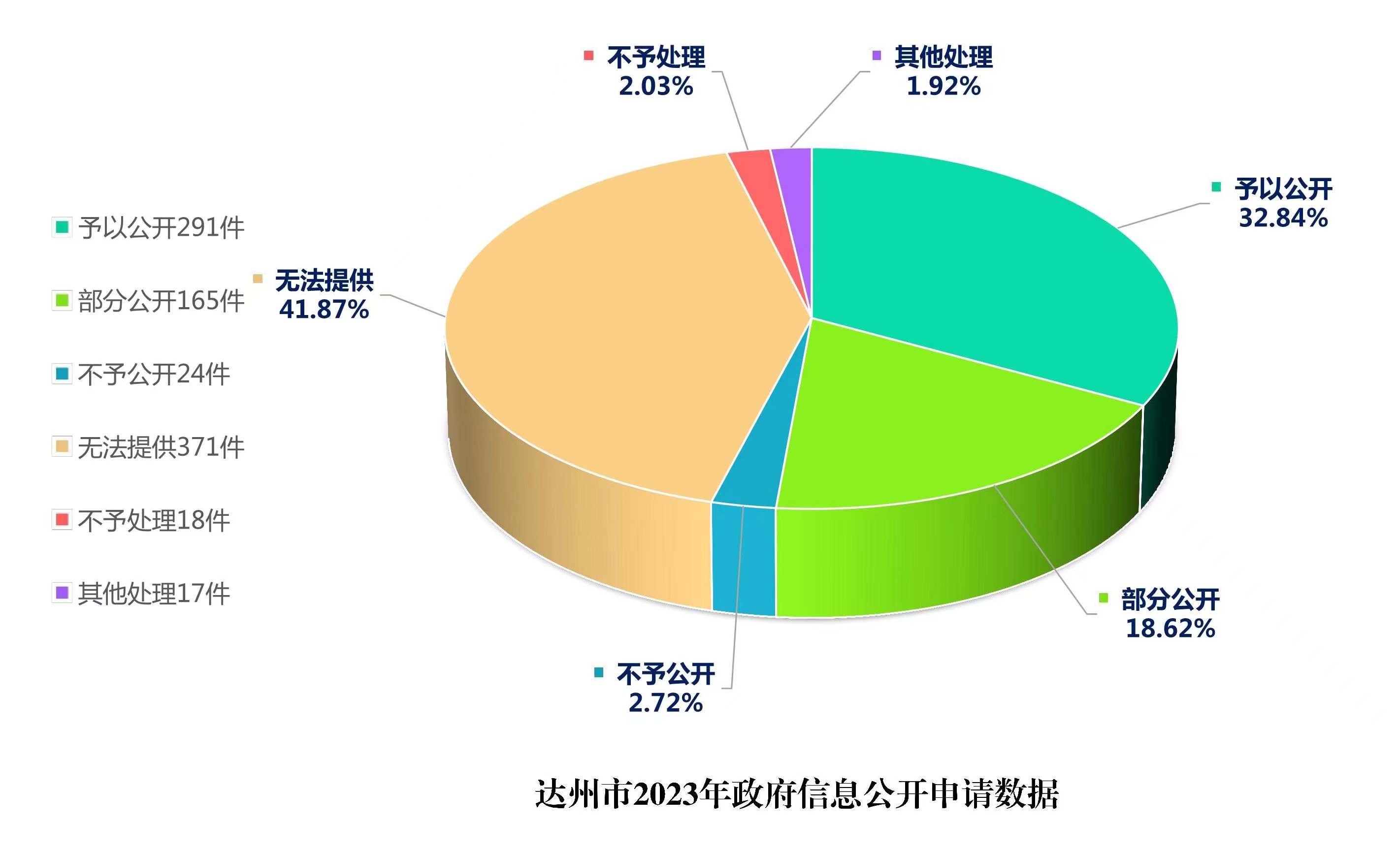 (二)依申请公开。完善依申请办理协调会商机制,提升政府信息公开申请办理质量,规范答复文书格式,增强答复内容规范性、合法性。全年共收到政府信息公开申请909件,结转上年度办理3件,办理完成886件,另有26件申请结转2024年继续办理。办理完成的政府信息公开申请中,予以公开291件,不予公开24件,无法提供371件。