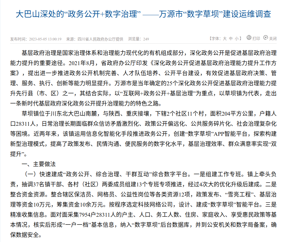 深化基层政务公开。认真落实《四川省人民政府办公厅关于深化政务公开促进基层政府治理能力提升工作方案的通知》,积极实施“互联网+政务公开+基层治理”,利用各地智慧乡村平台,探索构建基层新型治理模式。