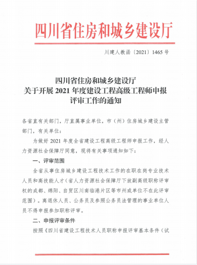 达州市住房和城乡建设局关于转发《四川省住房和城乡建设厅<关于开展2021年度建设工程高级工程师申报评审工作的通知>》的通知